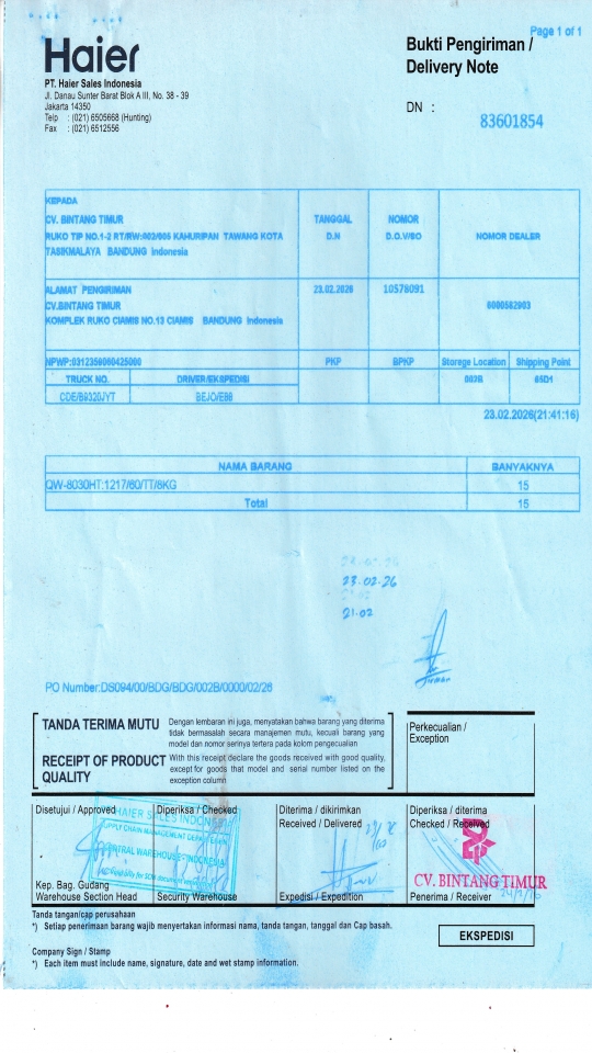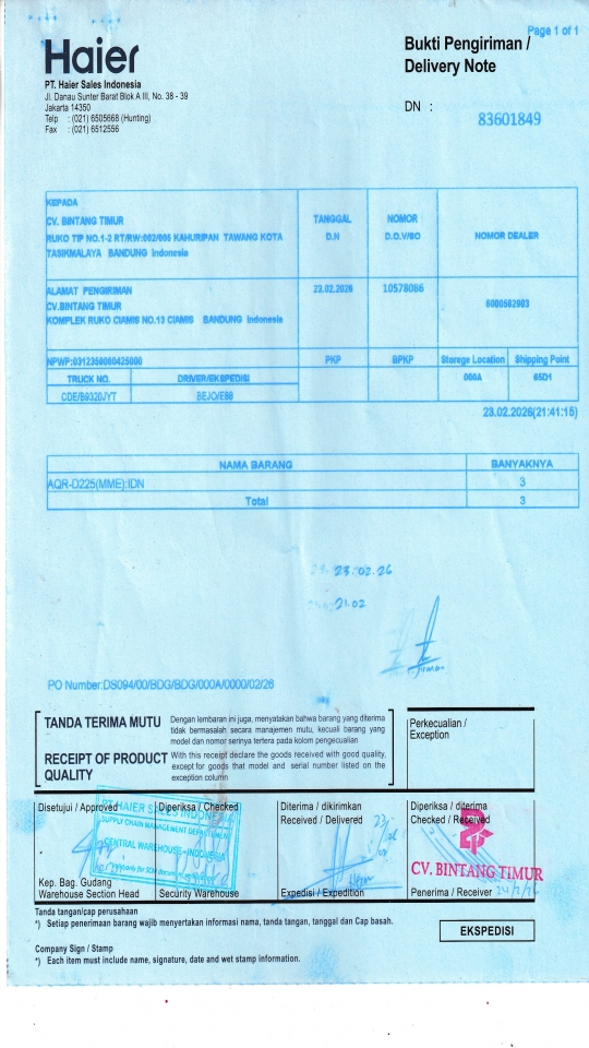 | Berangkat, Tiba, Bongkar | 2026-02-24, 2026-02-24, 2026-02-24 |