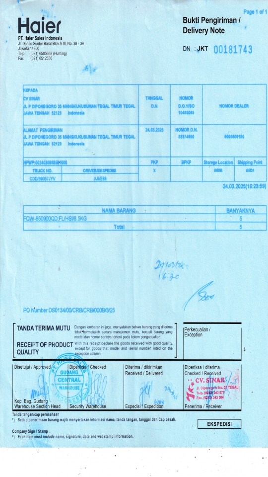 | 5 | 25/03/25 | SPM-23566 | 83374762 | 10485099 | TEGAL | CV SINAR | CA0002E00 | QW-7030HT | 15 | 5.08 | AJI | B 9057 JYV | 25/03/25 | DELY |  |