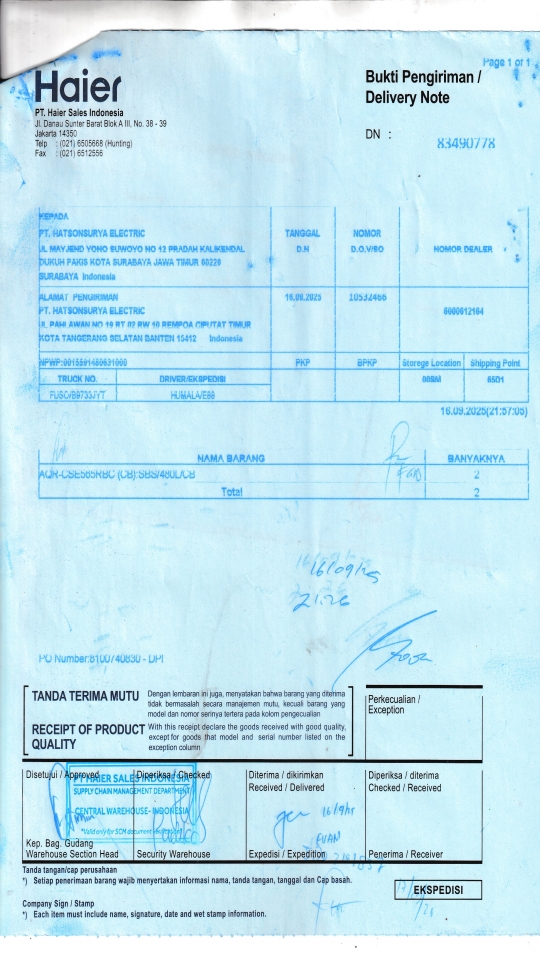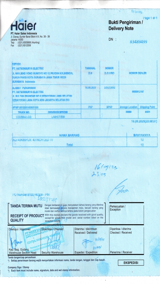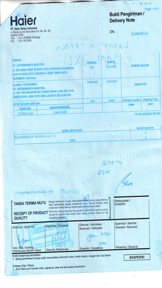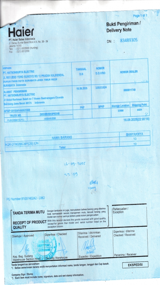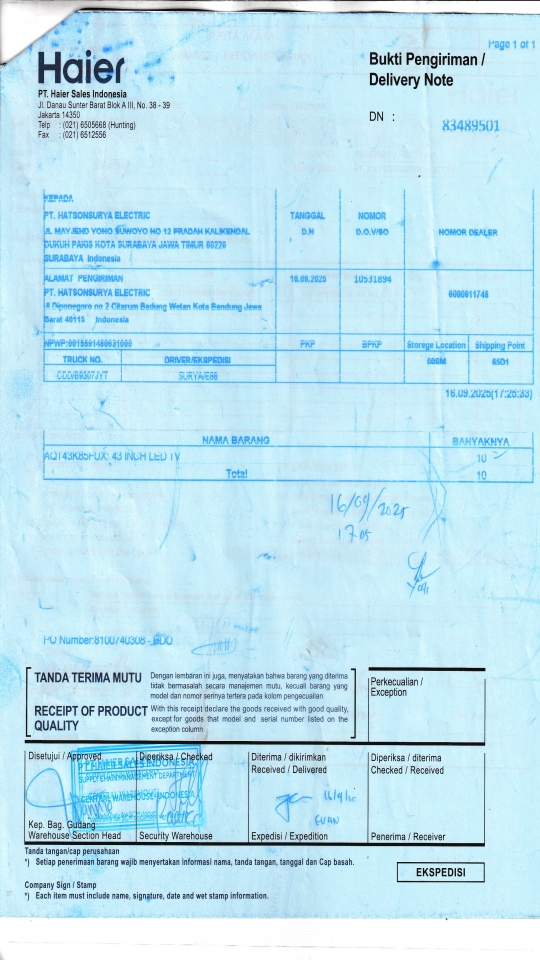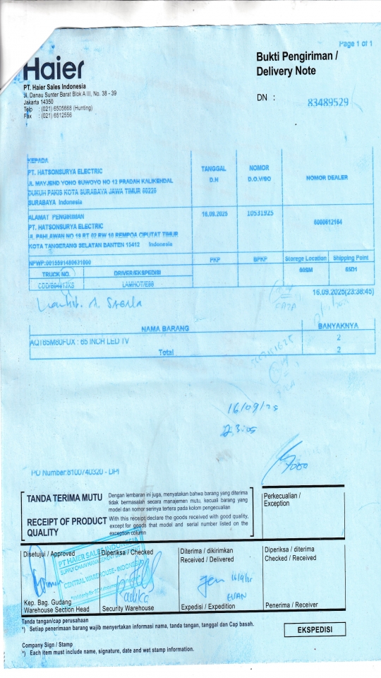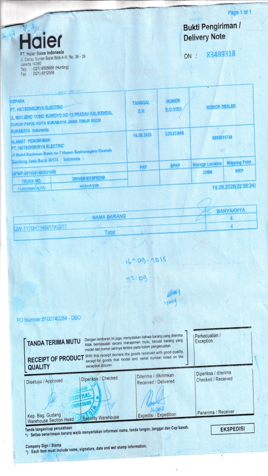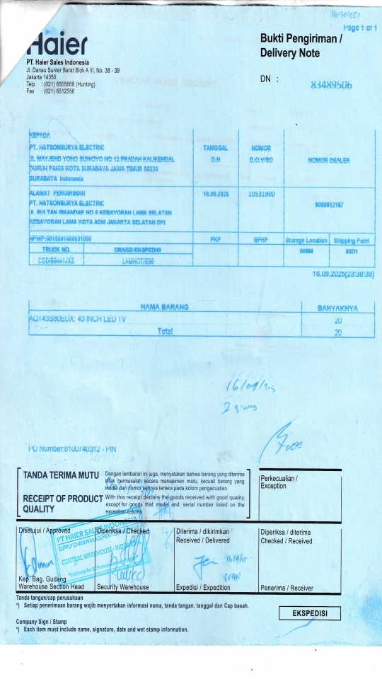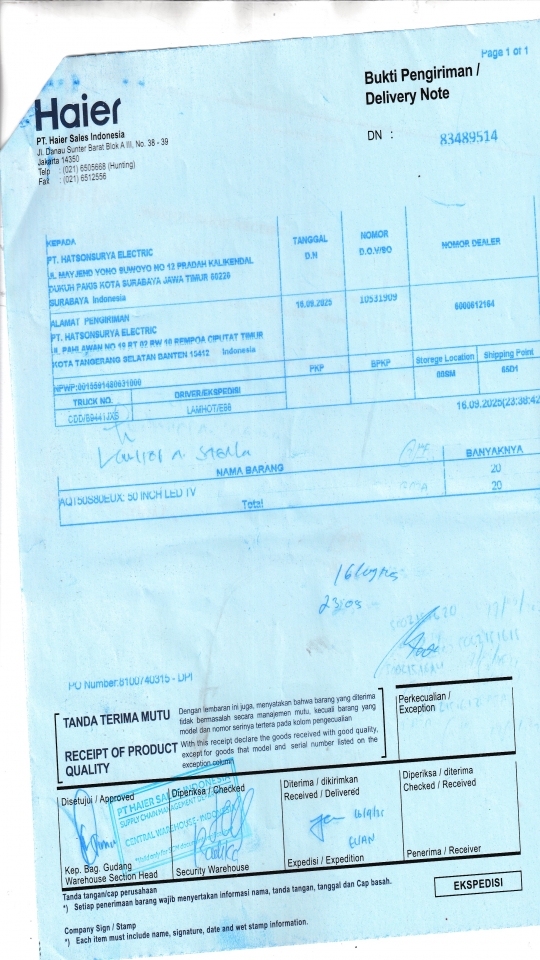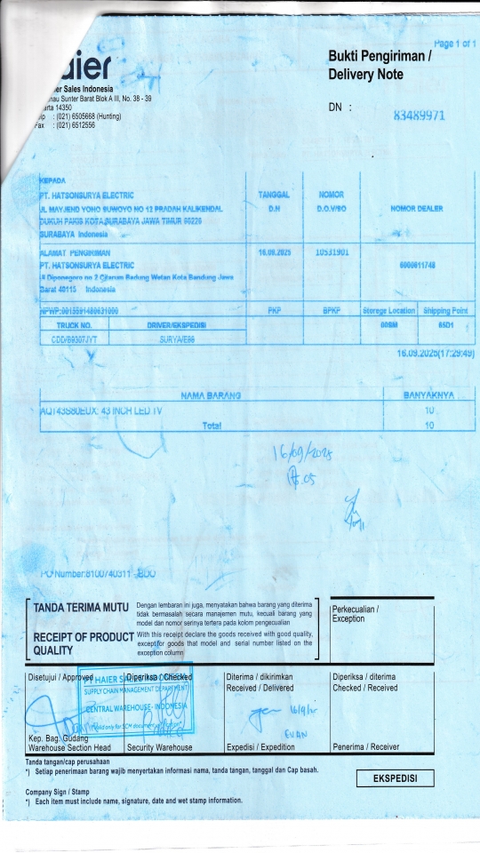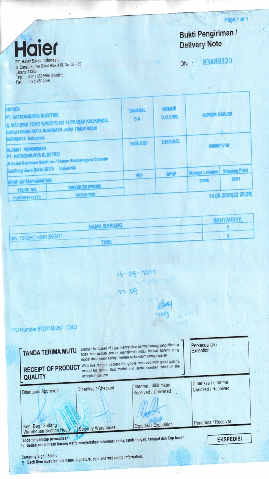 | Penerima | RENY WIDYA - HAIER SURABAYA |