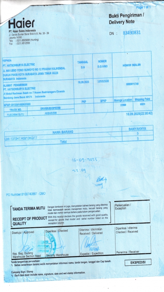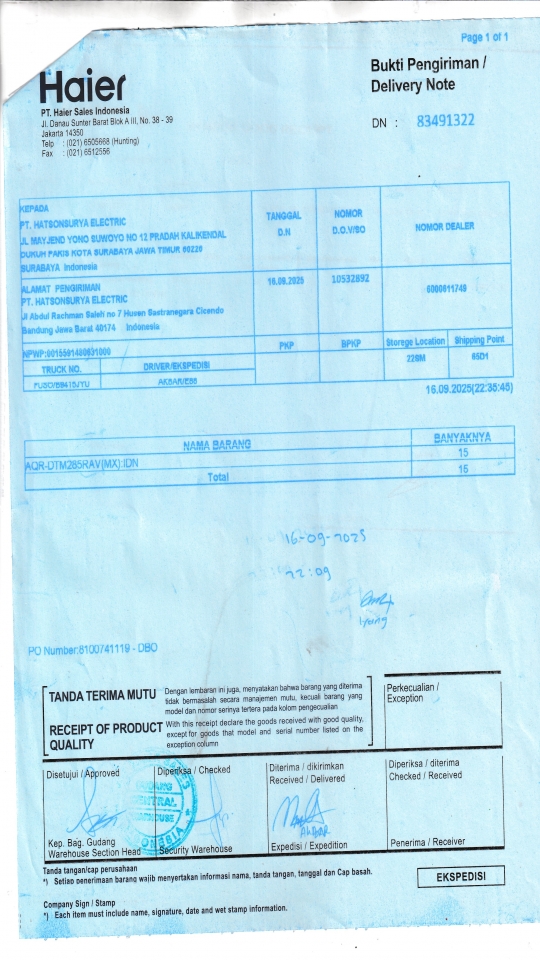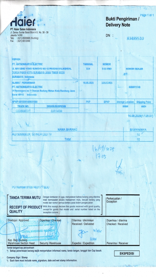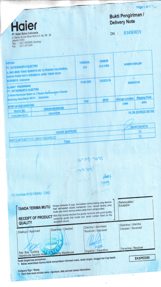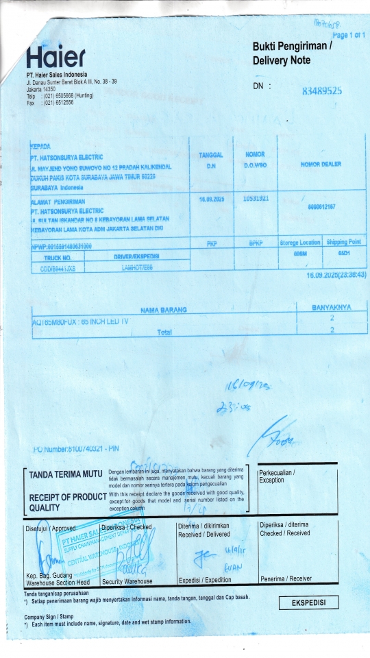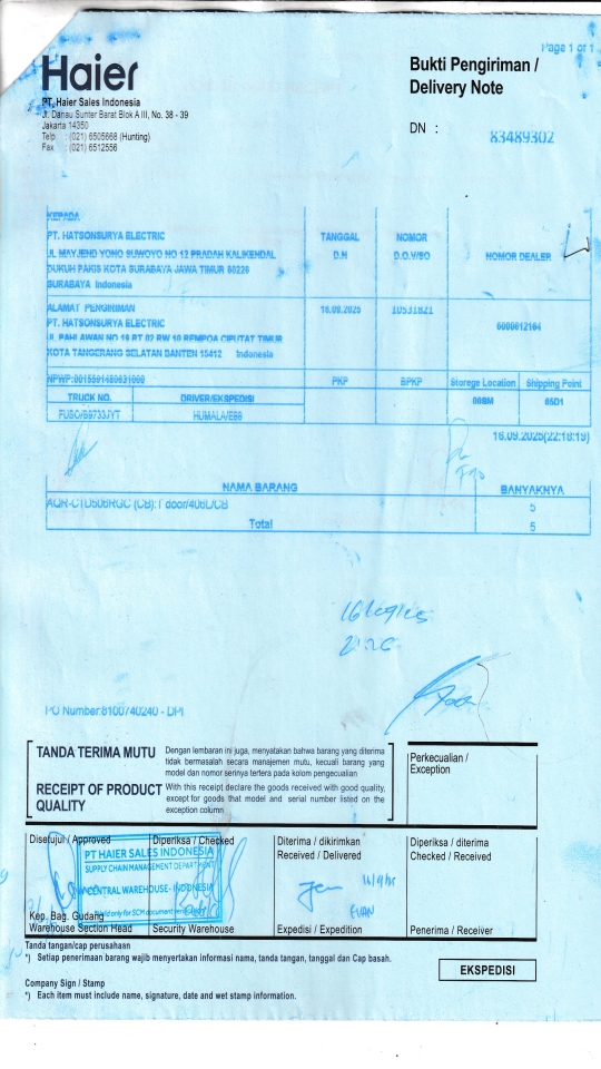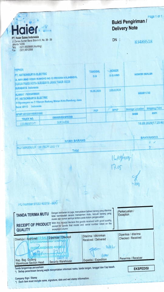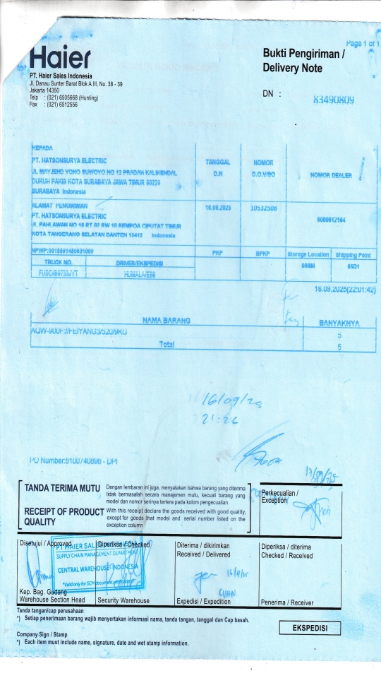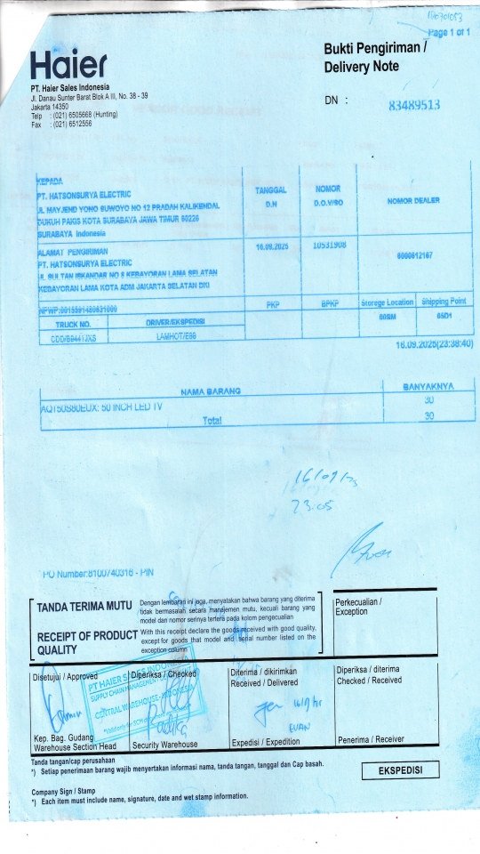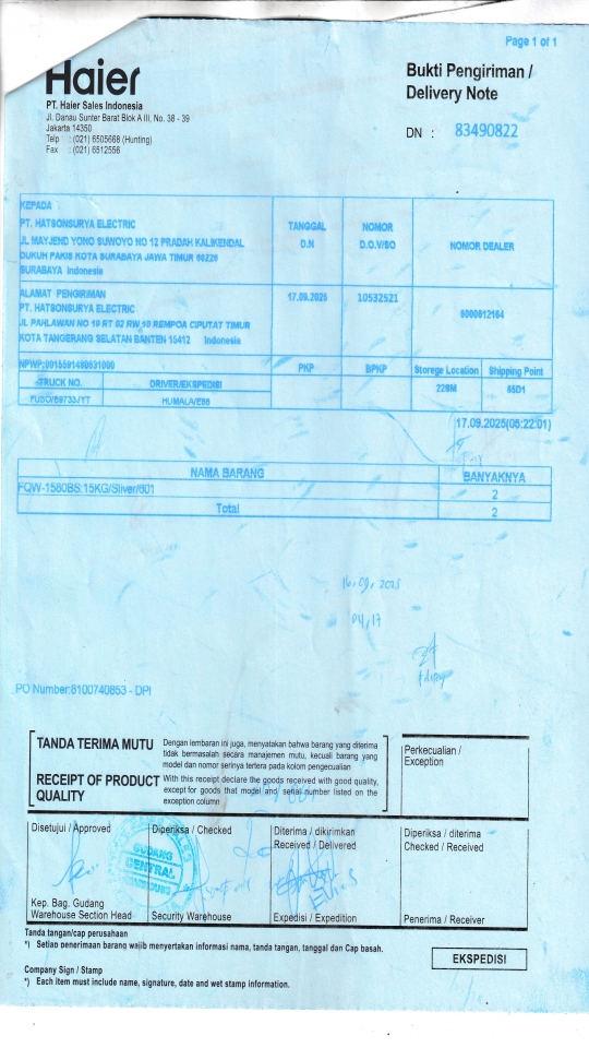 | Penerima | RENY WIDYA - HAIER SURABAYA |