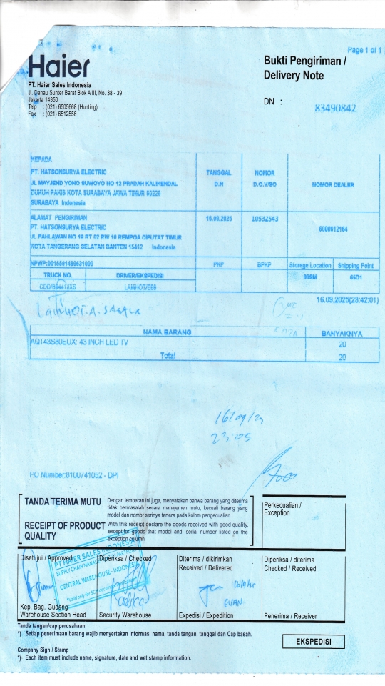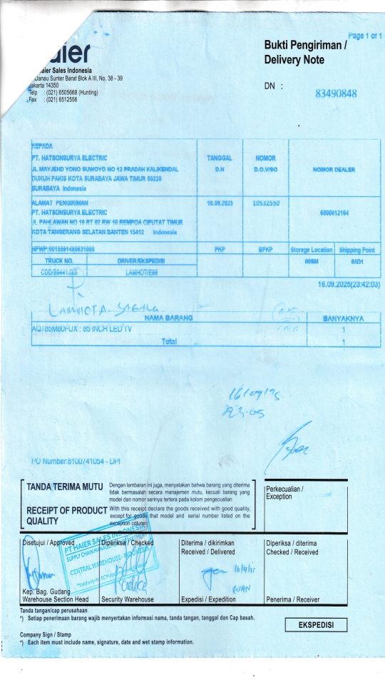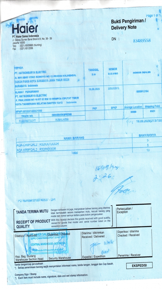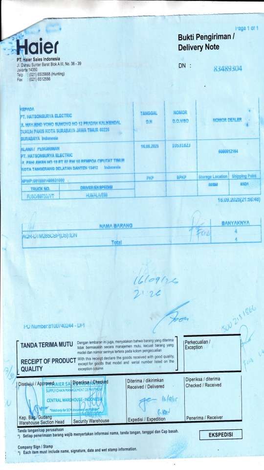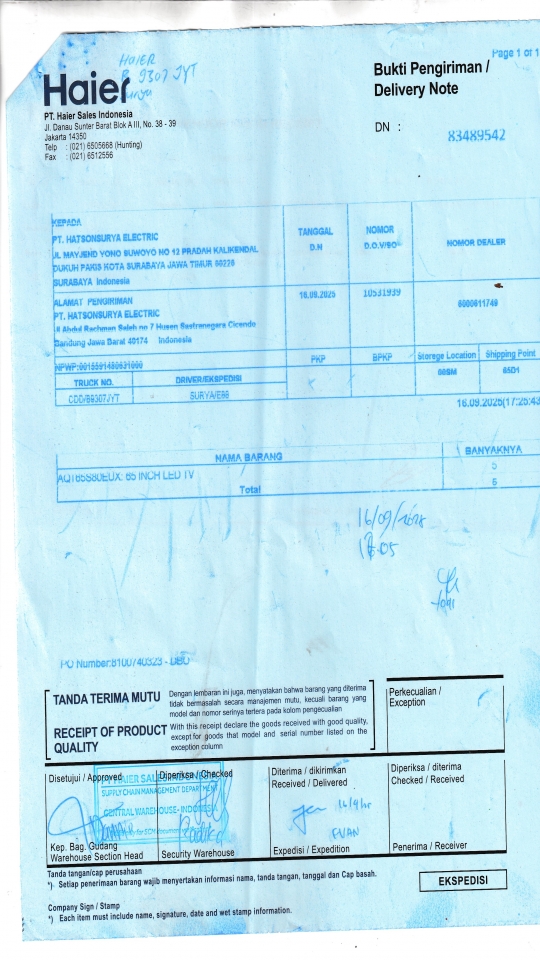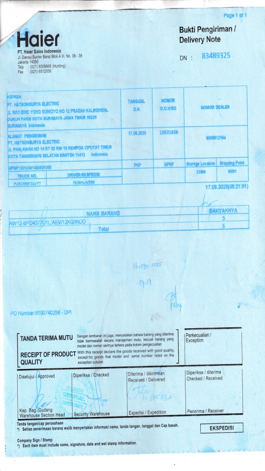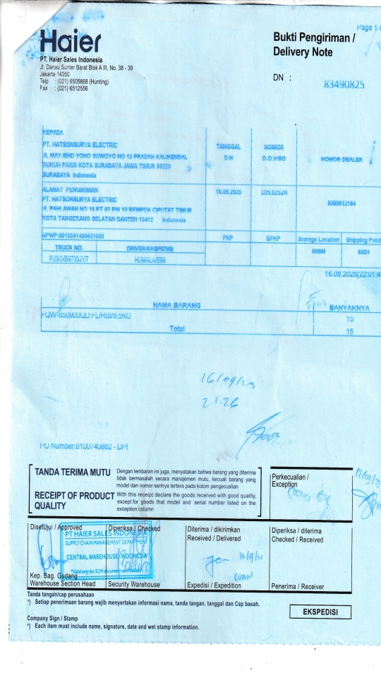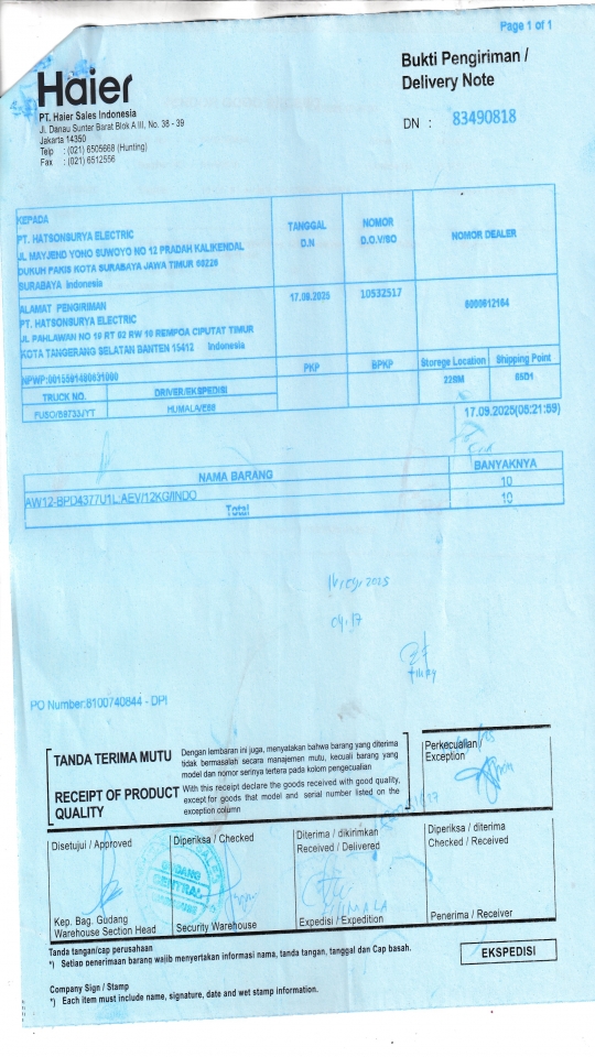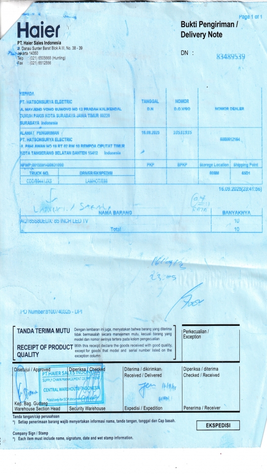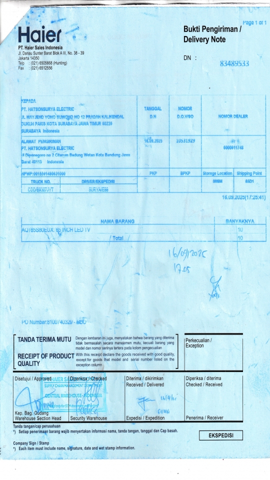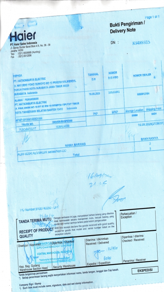 | Penerima | RENY WIDYA - HAIER SURABAYA |