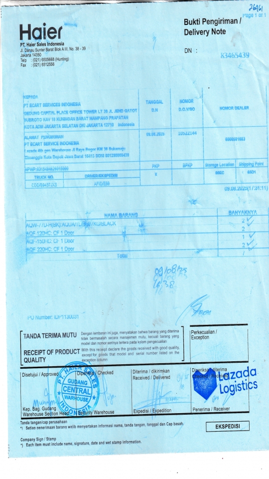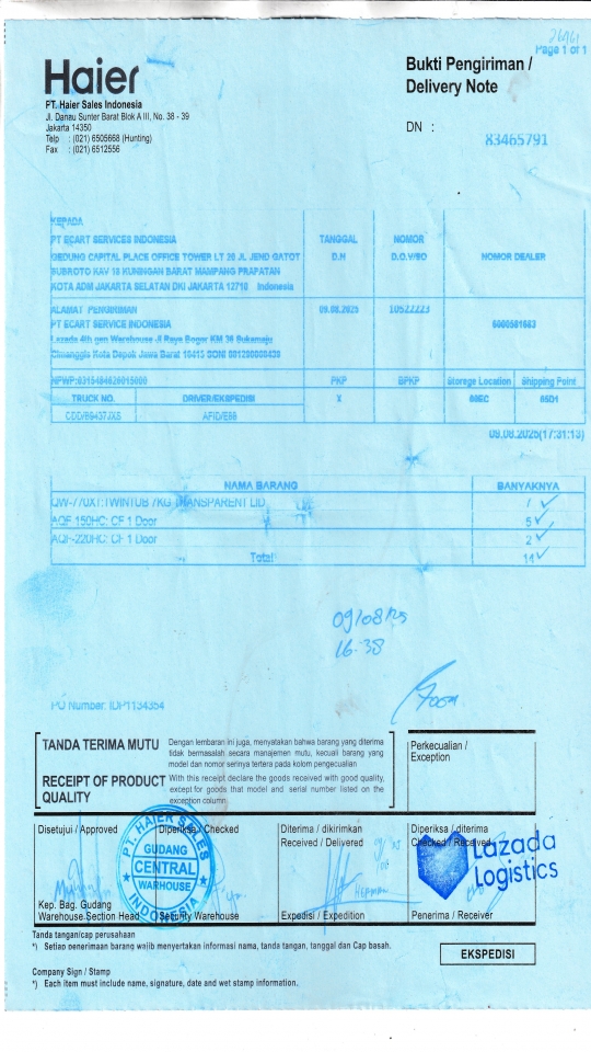 PT ECART SERVICE INDONESIA Lazada 4th gen Warehouse Jl Raya Bogor KM 36 Sukamaju Cimanggis Kota Depok Jawa Barat 16415 ID |