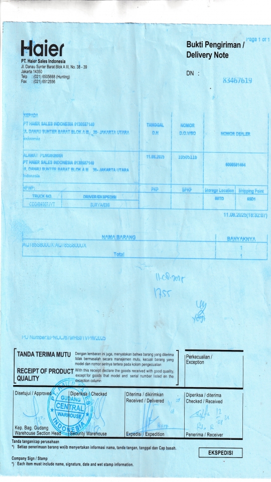 Penerima | PT HAIER SALES INDONESIA 0130587140 |