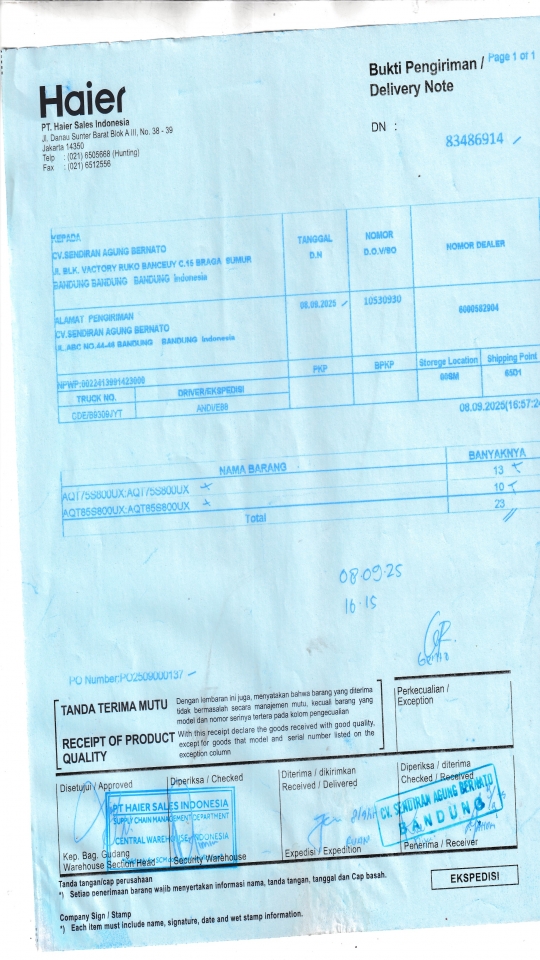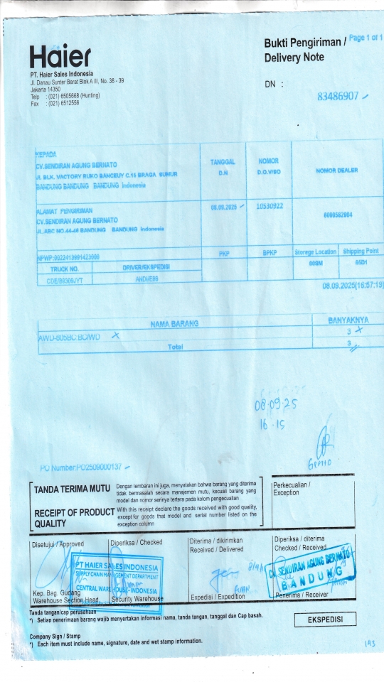 | Berangkat, Tiba, Bongkar | 2025-09-09, 2025-09-09, 2025-09-09 |