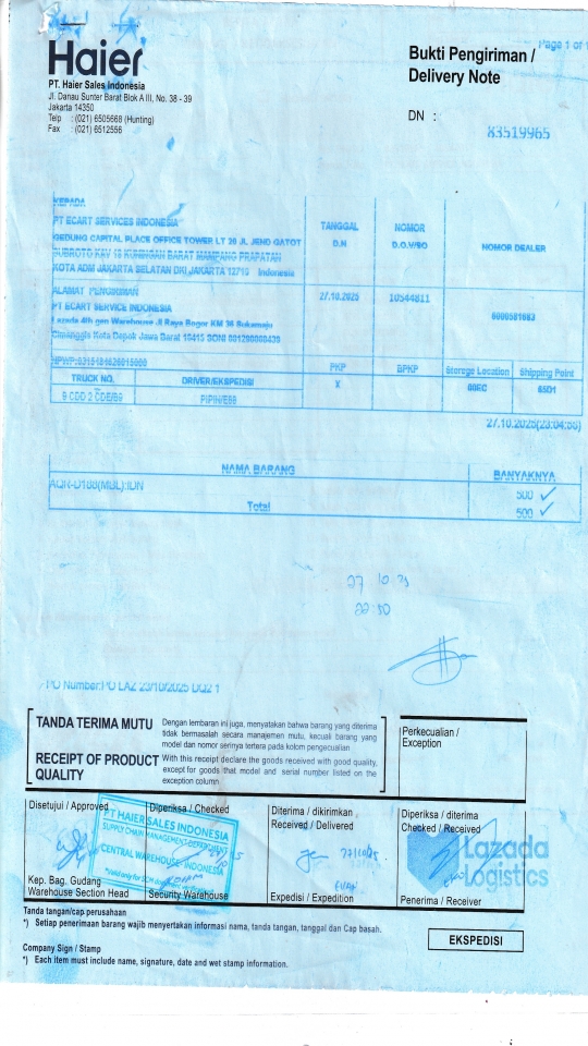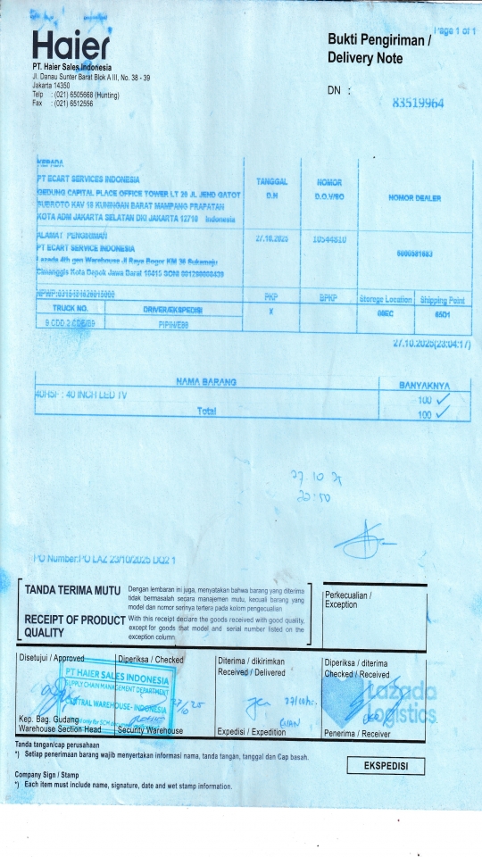 PT ECART SERVICE INDONESIA Lazada 4th gen Warehouse Jl Raya Bogor KM 36 Sukamaju Cimanggis Kota Depok Jawa Barat 16415 ID |