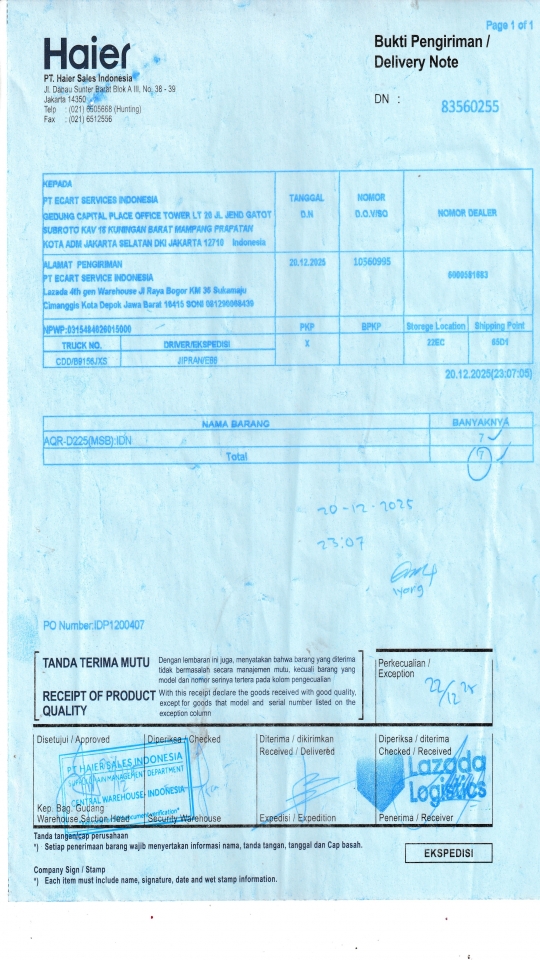 PT ECART SERVICE INDONESIA Lazada 4th gen Warehouse Jl Raya Bogor KM 36 Sukamaju Cimanggis Kota Depok Jawa Barat 16415 ID |