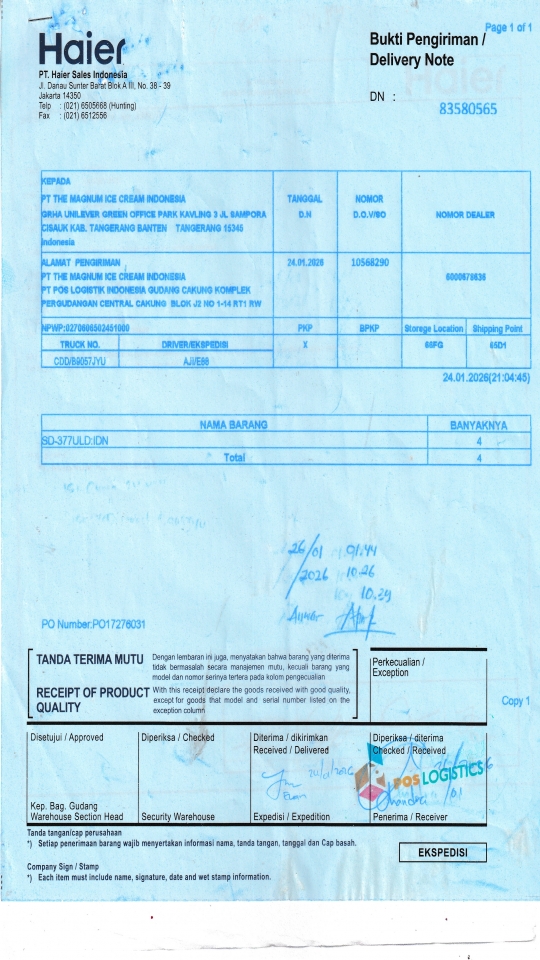 PT THE MAGNUM ICE CREAM INDONESIA PT POS LOGISTIK INDONESIA GUDANG CAKUNG KOMPLEK PERGUDANGAN CENTRAL CAKUNG BLOK J2 NO 1-14 RT1 RW 10 ROROTAN, KEC CILINCING JAKARTA UTARA 14140 ID |