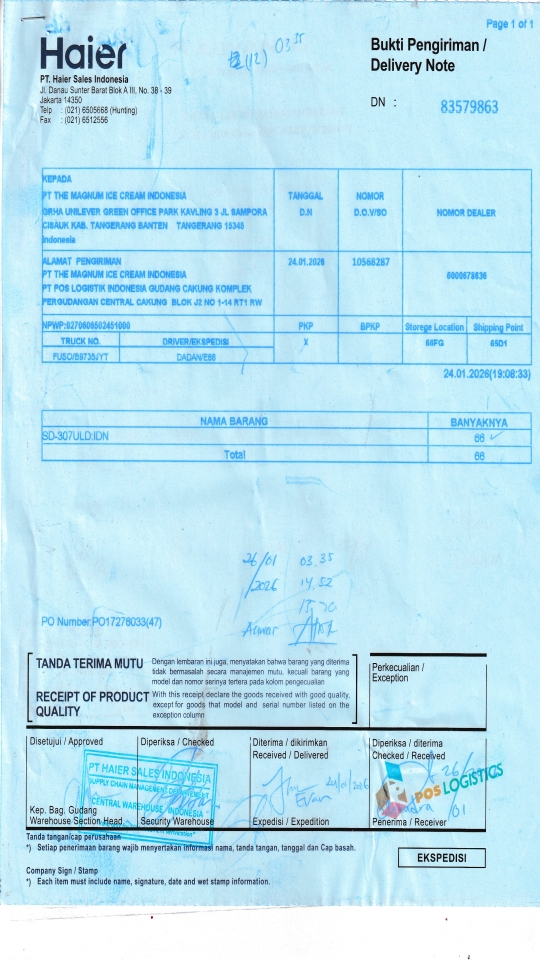 PT THE MAGNUM ICE CREAM INDONESIA PT POS LOGISTIK INDONESIA GUDANG CAKUNG KOMPLEK PERGUDANGAN CENTRAL CAKUNG BLOK J2 NO 1-14 RT1 RW 10 ROROTAN, KEC CILINCING JAKARTA UTARA 14140 ID |