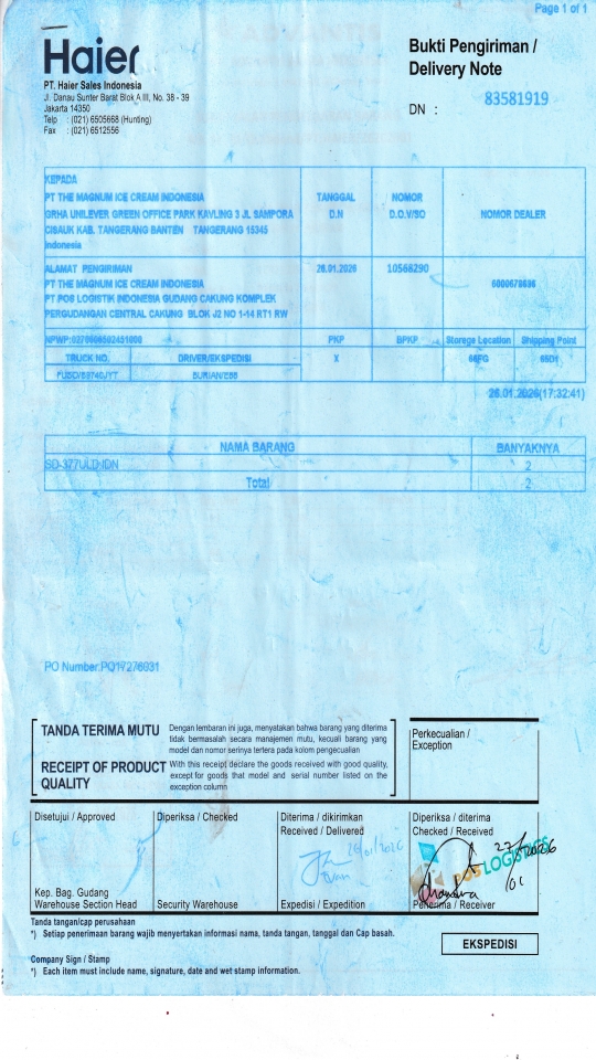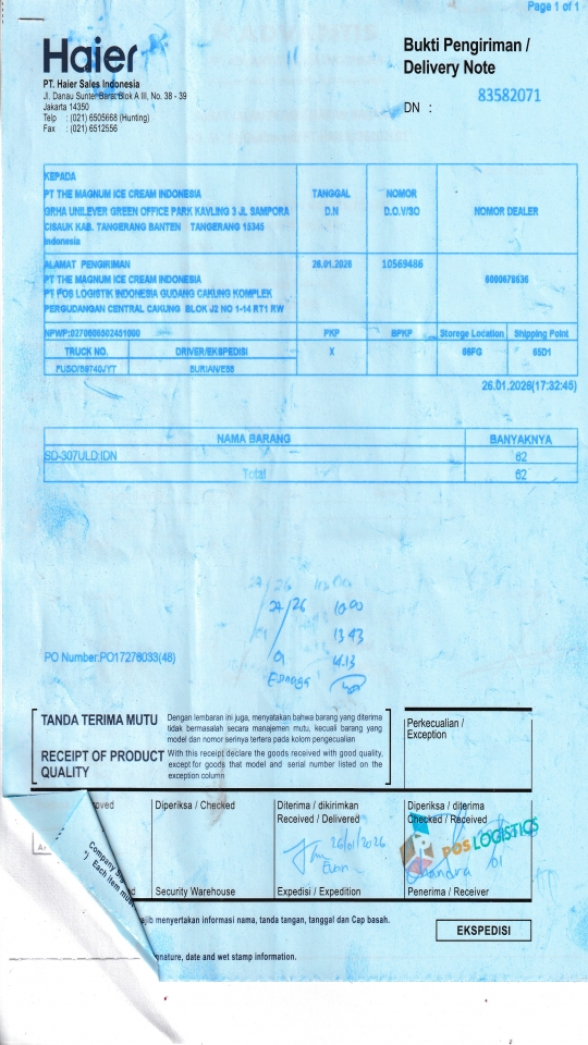 PT THE MAGNUM ICE CREAM INDONESIA PT POS LOGISTIK INDONESIA GUDANG CAKUNG KOMPLEK PERGUDANGAN CENTRAL CAKUNG BLOK J2 NO 1-14 RT1 RW 10 ROROTAN, KEC CILINCING JAKARTA UTARA 14140 ID |
