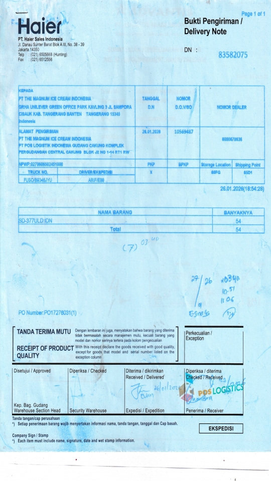PT THE MAGNUM ICE CREAM INDONESIA PT POS LOGISTIK INDONESIA GUDANG CAKUNG KOMPLEK PERGUDANGAN CENTRAL CAKUNG BLOK J2 NO 1-14 RT1 RW 10 ROROTAN, KEC CILINCING JAKARTA UTARA 14140 ID |