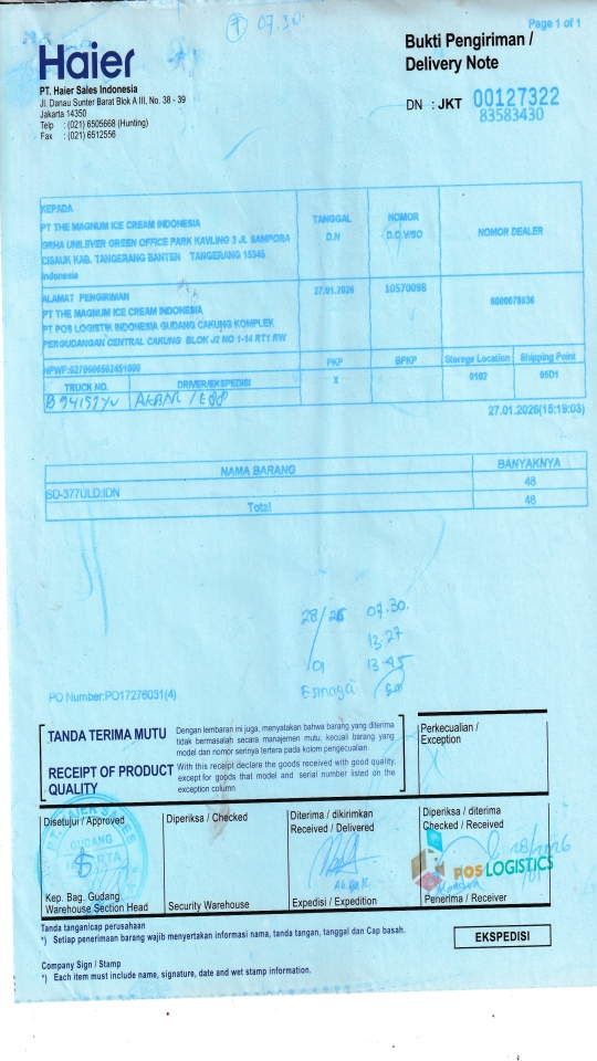 PT THE MAGNUM ICE CREAM INDONESIA PT POS LOGISTIK INDONESIA GUDANG CAKUNG KOMPLEK PERGUDANGAN CENTRAL CAKUNG BLOK J2 NO 1-14 RT1 RW 10 ROROTAN, KEC CILINCING JAKARTA UTARA 14140 ID |