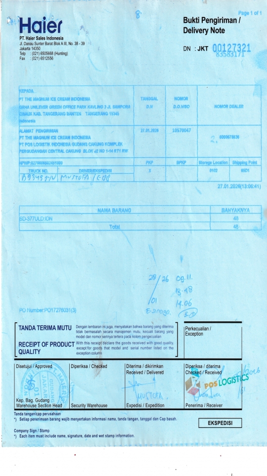 PT THE MAGNUM ICE CREAM INDONESIA PT POS LOGISTIK INDONESIA GUDANG CAKUNG KOMPLEK PERGUDANGAN CENTRAL CAKUNG BLOK J2 NO 1-14 RT1 RW 10 ROROTAN, KEC CILINCING JAKARTA UTARA 14140 ID |