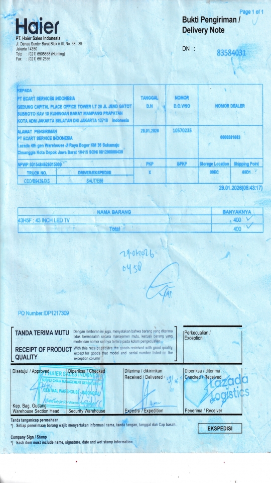 PT ECART SERVICE INDONESIA Lazada 4th gen Warehouse Jl Raya Bogor KM 36 Sukamaju Cimanggis Kota Depok Jawa Barat 16415 ID |