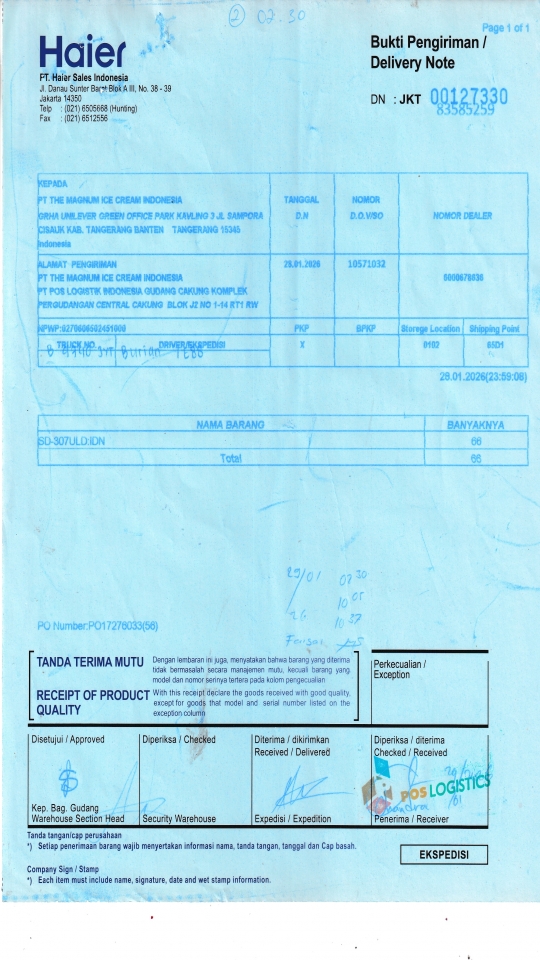 PT THE MAGNUM ICE CREAM INDONESIA PT POS LOGISTIK INDONESIA GUDANG CAKUNG KOMPLEK PERGUDANGAN CENTRAL CAKUNG BLOK J2 NO 1-14 RT1 RW 10 ROROTAN, KEC CILINCING JAKARTA UTARA 14140 ID |
