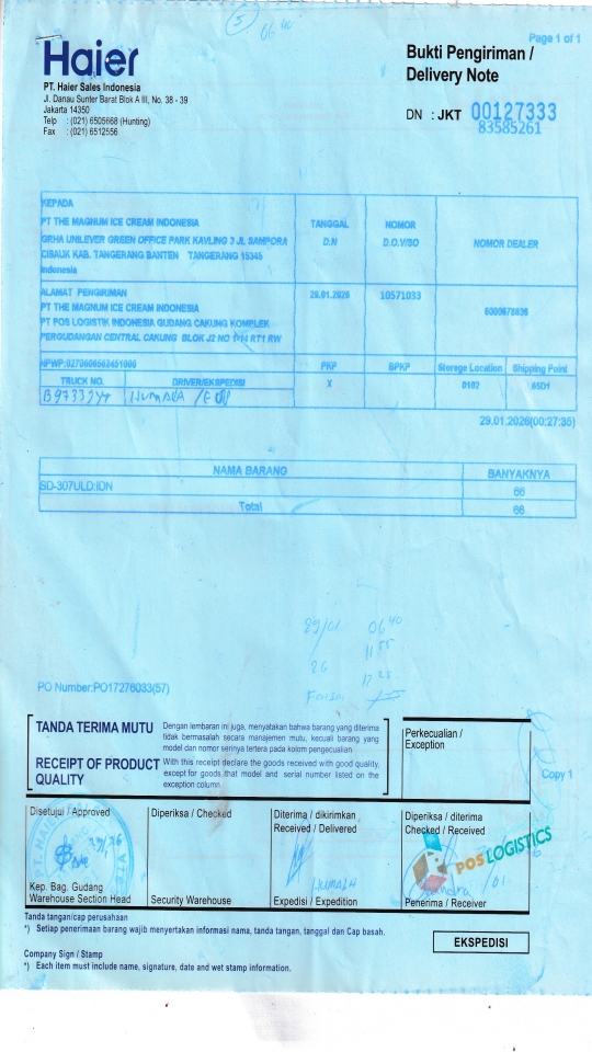PT THE MAGNUM ICE CREAM INDONESIA PT POS LOGISTIK INDONESIA GUDANG CAKUNG KOMPLEK PERGUDANGAN CENTRAL CAKUNG BLOK J2 NO 1-14 RT1 RW 10 ROROTAN, KEC CILINCING JAKARTA UTARA 14140 ID |