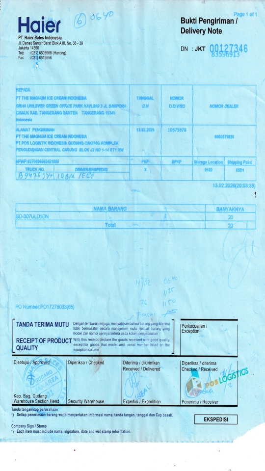 PT. Poslog (Gudang Unilever) Komplek Pergudangan Central Cakung Blok J2 No. 1-14, RT.1/RW.10, Rorotan Kec. Cilincing, Kota Jkt Utara, Daerah Khusus Ibukota Jakarta 14140 |