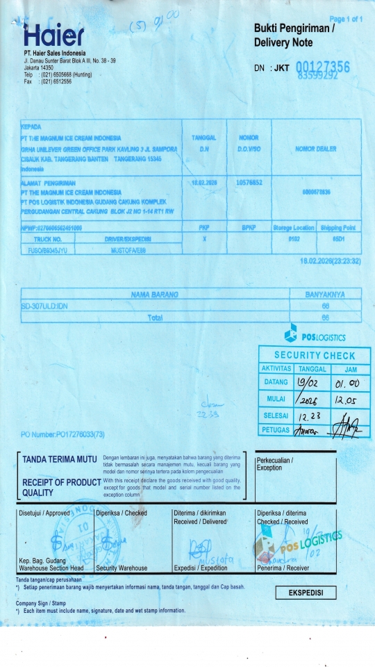 PT THE MAGNUM ICE CREAM INDONESIA PT POS LOGISTIK INDONESIA GUDANG CAKUNG KOMPLEK PERGUDANGAN CENTRAL CAKUNG BLOK J2 NO 1-14 RT1 RW 10 ROROTAN, KEC CILINCING JAKARTA UTARA 14140 ID |