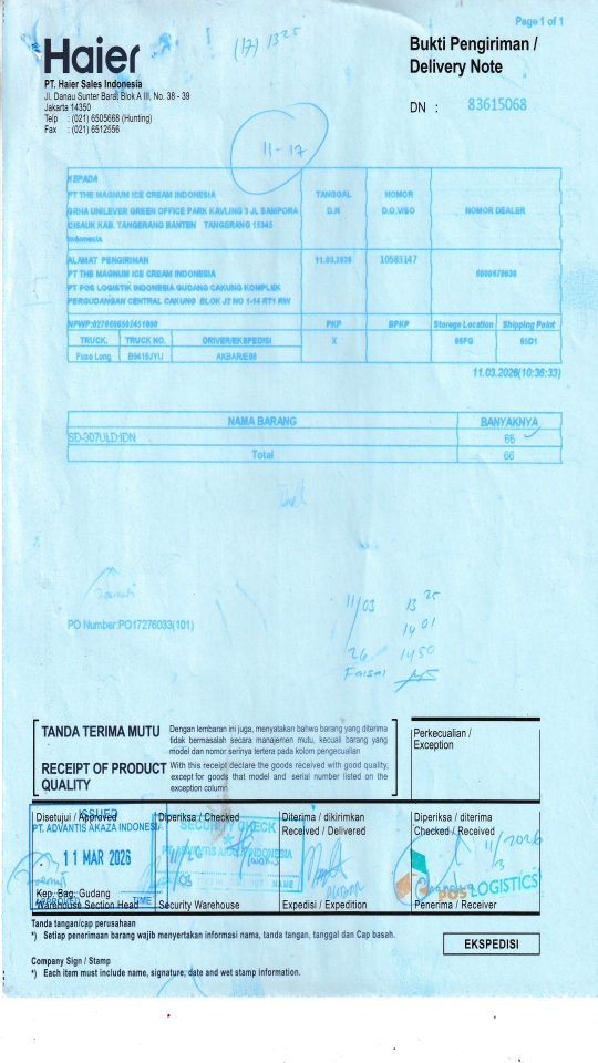 PT THE MAGNUM ICE CREAM INDONESIA PT POS LOGISTIK INDONESIA GUDANG CAKUNG KOMPLEK PERGUDANGAN CENTRAL CAKUNG BLOK J2 NO 1-14 RT1 RW 10 ROROTAN, KEC CILINCING JAKARTA UTARA 14140 ID |